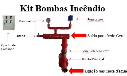 O kit é enviado montado, completo com bomba principal elétrica, bomba reserva elétrica e bomba jokcey, pressostatos, manômetro, válvulas de retenção, quadro de comando e conexões galvanizadas;
